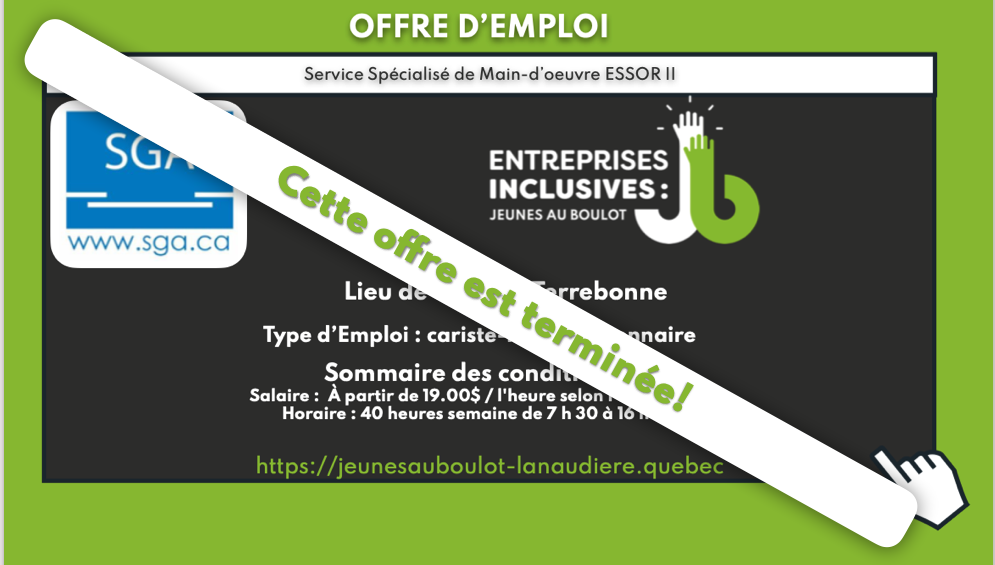 Faire parvenir votre curriculum vitae à Lyna Ranger : Tel : (450) 477-0526, Fax : (450) 477-0186, courriel : Lyna.ranger@sga.ca