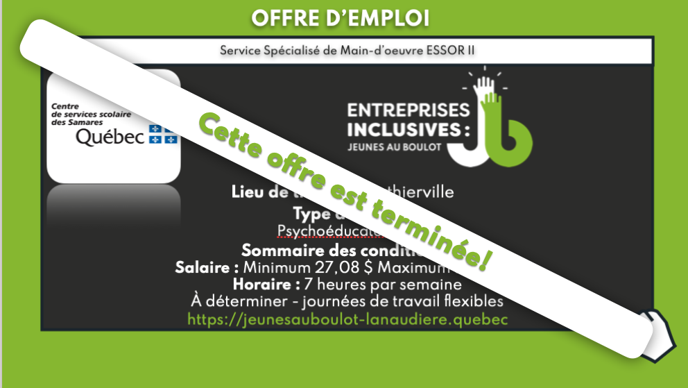Le Centre de services scolaire des Samares est à la recherche d’un·e PSYCHOÉDUCATRICE·TEUR.